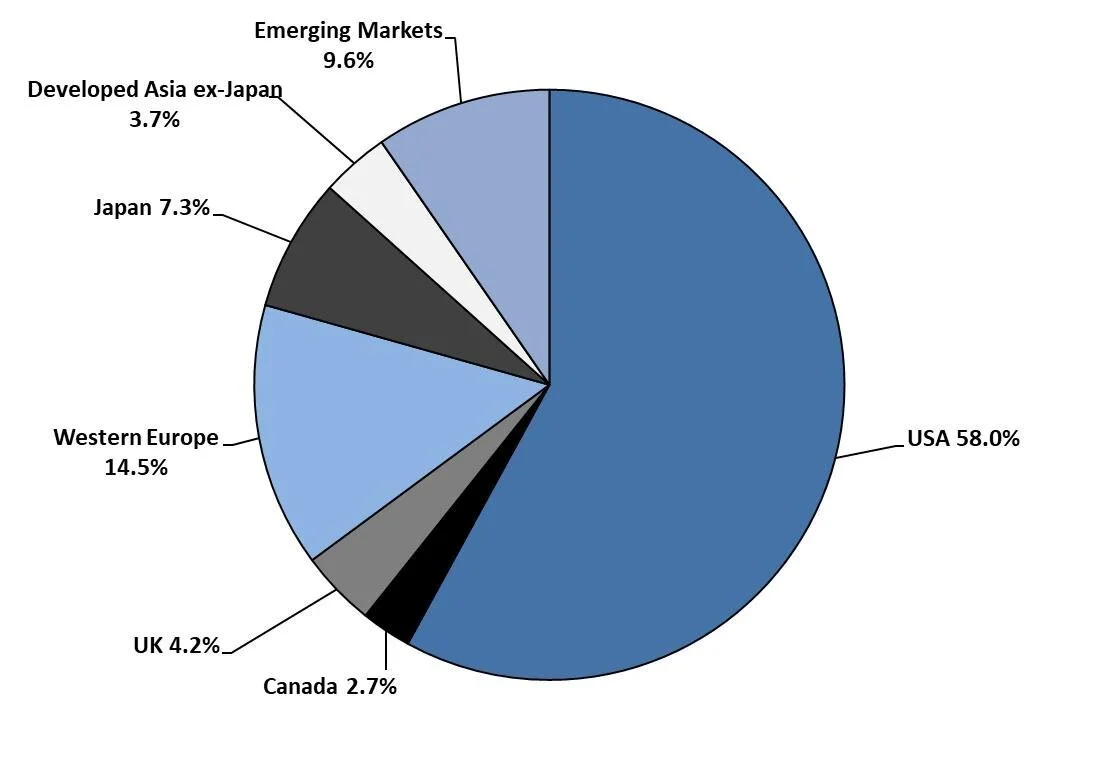 In Figure 1 we can see which segments make up the global equity market. Canada is currently 2.7% of the global equity market, the USA is the largest market with 58% while the rest of the developed markets such as Europe and Japan contribute 29.7% and emerging markets are the remaining 9.6% of which China is 4.7%. Naturally, after Canada, the next logical place for Canadians to invest has been in the USA, home to some of the biggest companies in the world just to the south of us. But what about the other 39.3%?
