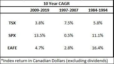 Global investing can also provide diversification, lower portfolio volatility and enhance returns. Chart 1 looks at 10 year equity index returns in Canadian dollars for the TSX, the S&P 500 and the MSCI EAFE index which includes Europe, Australasia and the Far East. We can see during different periods we can get varying degrees of performance from each market. From 2009 to 2019 the US S&P 500 was the best place to be. From 1997-2007 it was the Canadian TSX that provided the highest returns. From 1984 to 1994 the greatest returns were found in the international markets. Having diversified global exposure allows investors to capture higher potential returns in other markets and lowers overall volatility over the long term.