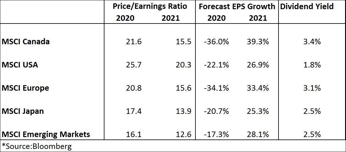 A third benefit to global investing is the ability to take advantage of regional differences in the economic cycle, valuation, earnings growth and momentum. In Table 2. we have compared different regional indices to their price-to-earnings ratio for 2020 and 2021 along with earnings-per-share growth and dividend yield. Currently we see that the US is the most expensive market by far. However, the US is also providing better visibility as earnings are more resilient than Canada or Europe during the recession. As we eventually get through the impacts of COVID-19 and look for economic improvement, both Canada and Europe may provide better cyclical recovery at more attractive valuation. Japan and emerging markets look particularly interesting as well as they both trade at a significant discount to other markets but does not have a worse earnings outlook.