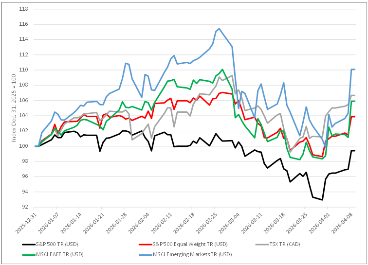 We observed significant rotation across various regions (Figure 1) and across multiple sectors. Canadian and international equities, including emerging markets, began the year strongly but have since moderated amid rising energy prices and the initiation of the Iran conflict. Within U.S. equities, the “Magnificent 7” has notably lagged the broader market, with companies such as Microsoft, Alphabet, Meta, Tesla, NVIDIA, Amazon, and Apple underperforming year to date. In contrast, the equally weighted S&P 500 has outperformed its market-cap-weighted counterpart by over four percentage points.