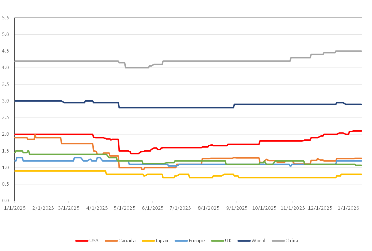We think tariffs and trade will be a main topic this year, but believe the peak fear occurred after “Liberation Day”. Since then, the US has reached many deals with other countries, settling on specific tariff rates applied to imports from each country. In general, tariff-related risks are lower now than a year ago. We also have to remember that two-thirds of the US economy is service-based, rather than goods-based. As a result, the impact of tariffs on inflation has so far been manageable. As for Canada, some sectors remain negatively impacted, including steel, aluminum, and lumber. The USMCA expires in 2026 and will need to be renegotiated. We expect significant headline risk from President Trump on this issue, but ultimately believe a deal will be reached and will have much more clarity sometime in the second half of the year.